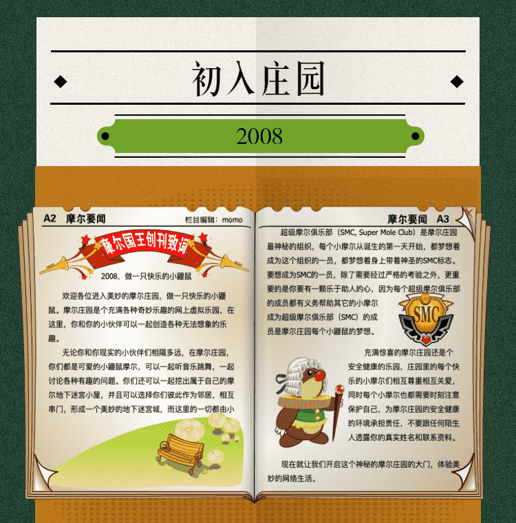 在这一年,,,摩尔庄园诞生了。。。在这里,,,大家都是可爱的红鼻子鼹鼠小摩尔,,可以一起勤劳耕作,,,一起高山滑雪......我们都是摩尔庄园的建设者。。
