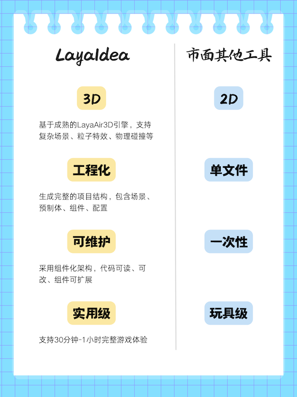 基于LayaAir引擎,,LayaIdea构建了一套完整的工业级AIGC开发流程,,,,实现了从策划文档到完整3D游戏项目的自动化生成,,,与市面现有AIGC工具在技术能力、、实用性上形成显著差异,,,,具体对比如下::